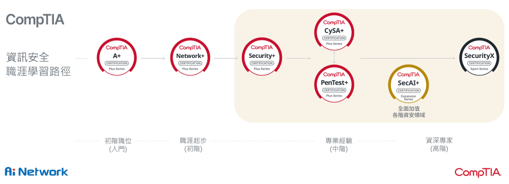 奠基於 Security+ (同適用於CySA+, PenTest+, SecurityX)之資安領域知識,結合 SecAI+ 的全方位擴充,將全面升級您的資安戰力,成為 AI 時代不可或缺的頂尖資安人才。